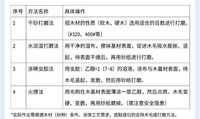 2、除木毛木毛一旦接觸或吸收水分或溶劑,就受濕潤膨脹而豎起來,使顏色無法均勻著色與木紋內部,而堆積在它周圍,出現木紋(導管)內部未著上顏色的不良,打磨后就出現了小白點(芝麻點)。所以,涂飾前一定要充分打磨去除木毛(薄片材料時,要避免砂穿),為涂裝和著色提供一個優質的基底條件。