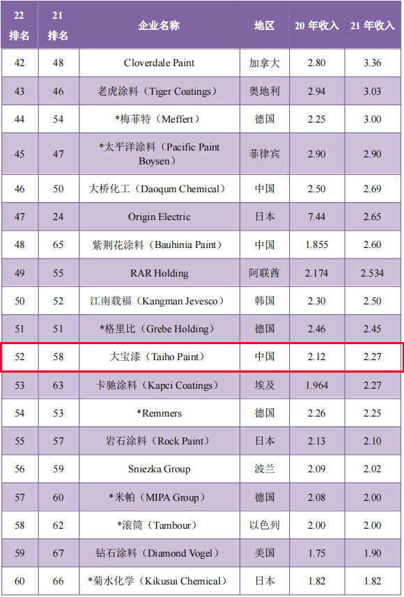 2022全球涂料制造企業(yè)排行榜(大寶漆位列52名)