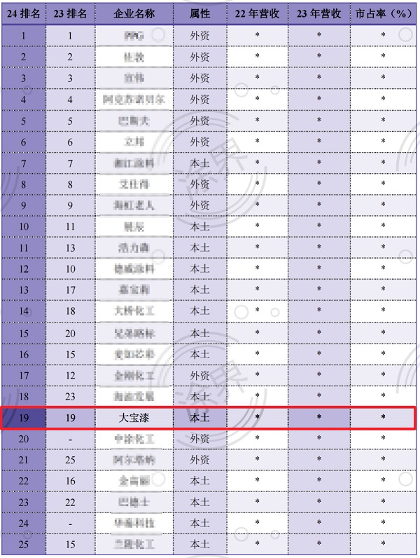 近日,國(guó)內(nèi)涂料行業(yè)專業(yè)財(cái)經(jīng)媒體《涂界》發(fā)布“2024中國(guó)工業(yè)涂料品牌25強(qiáng)榜單”,榜單匯聚了國(guó)內(nèi)最具影響力的工業(yè)涂料品牌。其中,大寶漆今年位列第19名,連續(xù)兩年蟬聯(lián)中國(guó)工業(yè)涂料前二十強(qiáng)。(數(shù)據(jù)來(lái)源:涂界)