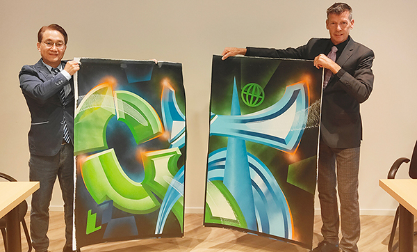 此次簽約儀式別具創(chuàng)意與情感意義,高樂(lè)伯總裁Kees特別邀請(qǐng)當(dāng)?shù)刂?huà)家以“G”與“T”兩個(gè)字母為主題,分別代表Global Paint與Taiho Paint,創(chuàng)作一幅融合東西方藝術(shù)語(yǔ)匯的油畫(huà)作品。簽約當(dāng)日,雙方代表共同剪下畫(huà)作中央,各自保留一半,象征兩家企業(yè)跨越地域、文化的深度連結(jié)。