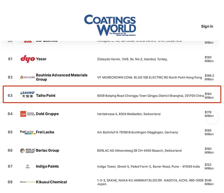 近日,美國(guó)權(quán)威雜志《涂料世界》(Coatings World)發(fā)布了2025年全球頂級(jí)涂料企業(yè)排行榜。作為中國(guó)涂料行業(yè)的優(yōu)秀企業(yè),大寶漆憑借卓越的產(chǎn)品品質(zhì)和持續(xù)創(chuàng)新能力,再度上榜。