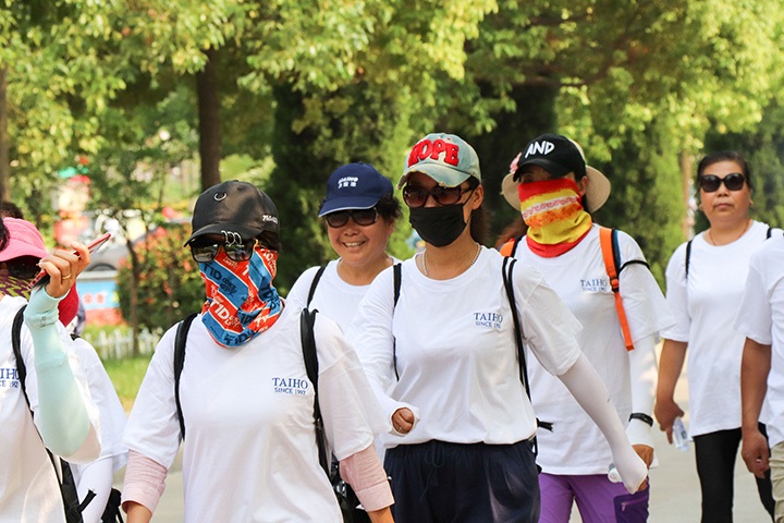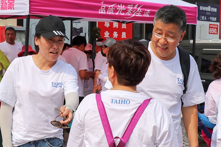 在工作人員的指引下,參賽隊伍高舉印有“大寶漆,品質(zhì)光彩生活”的旗幟徐徐前進,形成一道道亮麗的風景線。長長的隊伍從起點出發(fā),沿途,大寶漆工作人員為參賽者準備了飲用水補給,運動愛好者們一路走走拍拍,用腳步和汗水感受運動的樂趣。