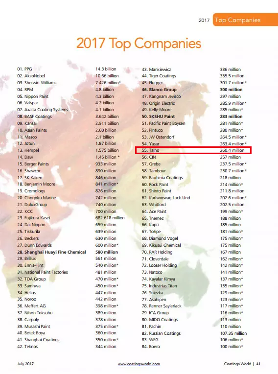 日前,美國Coatings World雜志(July 2017)最新發(fā)布2017年全球頂級涂料制造企業(yè)銷售額排行榜(前84名)(2017 Top Companies),中國5家涂料企業(yè)殺入重圍。大寶漆再次進入該榜單,位列第55名,較上年排名前進了三位。