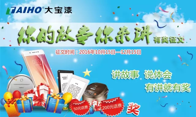 為更好地促進(jìn)大寶漆各經(jīng)銷商同仁間的交流與互助,讓經(jīng)銷商同仁分享成功的經(jīng)驗(yàn),通過分享市場第一線員工的成功案例及心得體驗(yàn),并以此作為學(xué)習(xí)楷模,取其智慧精華,促使各地經(jīng)銷商同仁互補(bǔ)優(yōu)勢、共同提升,故大寶漆官方微信和大寶報(bào)聯(lián)合主辦“你的故事你來講”有獎(jiǎng)?wù)魑幕顒印?