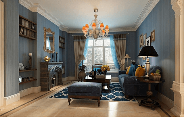 相近色深藍(lán)色+公主藍(lán)+對比色橙色燈罩點綴,空間飽滿而不亂,沉靜中帶點活潑,一切剛剛好。